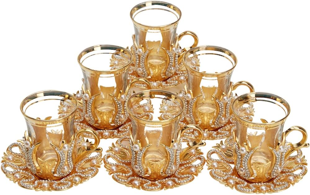 Turkish Tea Glasses Set of 6. Handmade in Turkey. Color : Gold. Capacity : 3.3 Oz.