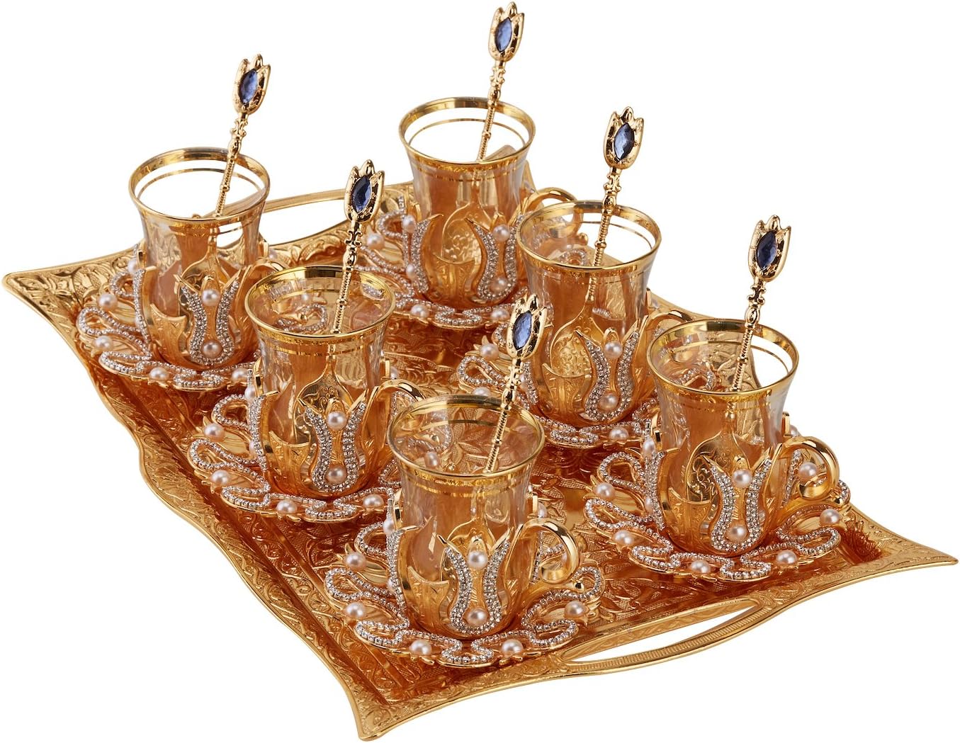 25 Pieces.1 TRAY, 6 Glasses, 6 Glass Holders, 6 Saucers, 6 Spoons (Spoon color & design may vary).